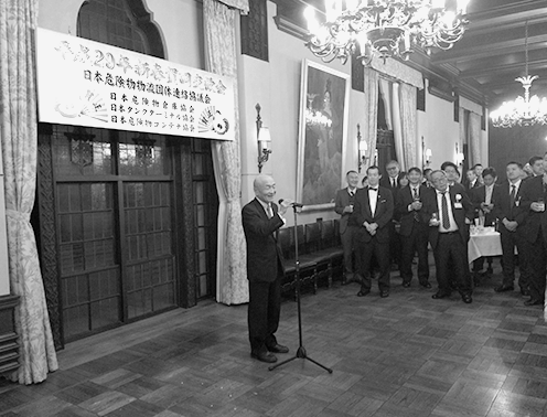 日本危険物物流団体連絡会(日本危険物コンテナ協会・日本危険物倉庫協会・日本タンクターミナル協会) 22日午後5時から東京・銀座の交詢社で開催し、約150名が参加した。
