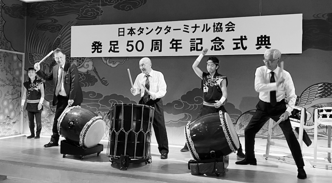祝賀会では和太鼓のパフォーマンスが披露され、危物協の大森会長、前JTTA会長の内外輸送の小幡社長、NRSの田中社長が和太鼓に挑戦。中締めの挨拶を関西支部長の太田英之氏(辰巳商会)が行い、「JTTAが今後100年続き、社会的に認知される団体になっていくには、安全・安心を担保できる団体であることが不可欠だ」と強調した。